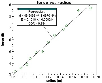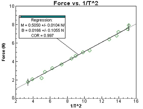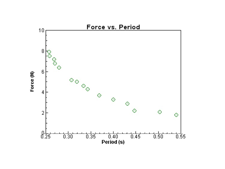 ![]() | The graph lower left shows the relationship between the force and period at a constant radius. The graph below is the linearized graph of force verses period and shows the that the force is proportional to the inverse square of the period. These graphs are typical of the results most student groups achieve. Naturally some get better results, some not as good. In general, I have been very pleased with the results of this lab. No more glass tubes and stoppers for me! |