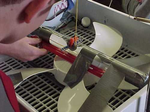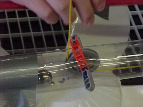is cut in the top and a pulley is attached as shown (I used Knex). The tube is then attached to the fan using a screw (the ones that held the fan cover on) and tape. The pulley is aligned so that one edge is above the center or rotation for the fan. A small mass is attached to a string and placed in the tube so that the string wraps around the pulley. The ball bearing acts as a counter weight on the other end of the tube. |